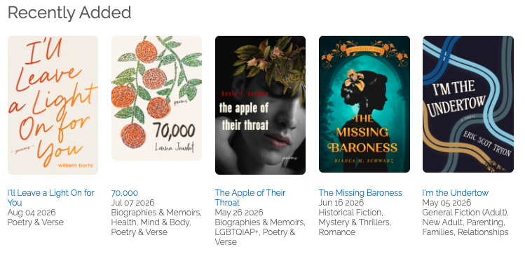 Wow, thank you for asking about it! It came about after Winter Institute in 2025 when so many booksellers said they just didn’t know what to do with their poetry sections. Before my career in publishing I spent an equal amount of time in market research – much of that advising grocery and drug retailers how to optimize their sections. I decided to use these same principles of good assortment and shelf planning that large booksellers and other retailers use and adapt it for independent booksellers who don’t have a poetry expert on staff. It’s based on how consumers buy poetry (the same buyer doesn’t usually purchase a TikTok star’s book and Chaucer). It’s then coupled with data from the Bookscan bestseller list, and then I add in a bit of research on a feature section for the month. For example, March was Women and Spring, featuring books by great women poets about renewal and feminine energy. It’s been a huge hit and I’m honored to share it for free every month with booksellers via our website and an ongoing feature in Shelf Awareness.