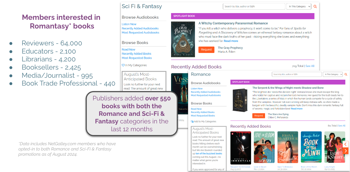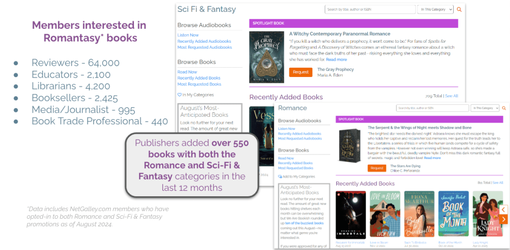 NetGalley offers a wealth of insightful data that sheds light on the latest trends and preferences, and we’re thrilled to focus on Romantasy books this month. If you haven’t browsed Romance + Fantasy categories recently, you may be missing out! In the past 12 months, publishers have added over 550 new books that have both of these categories, generating a lot of engagement and excitement from the NetGalley community.